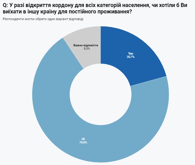 Згідно з дослідженням, в якому взяли участь 1518 осіб віком 18 років та старше, 20,7% респондентів виявили намір виїхати на постійне місце проживання. Це значна цифра, враховуючи, що не менше трьох мільйонів українців вже покинули свою країну. При цьому серед досліджених, більшість бажають залишитися в Україні, однак це переважно представники старшого покоління, тоді як ситуація серед молоді виглядає зовсім по-іншому.