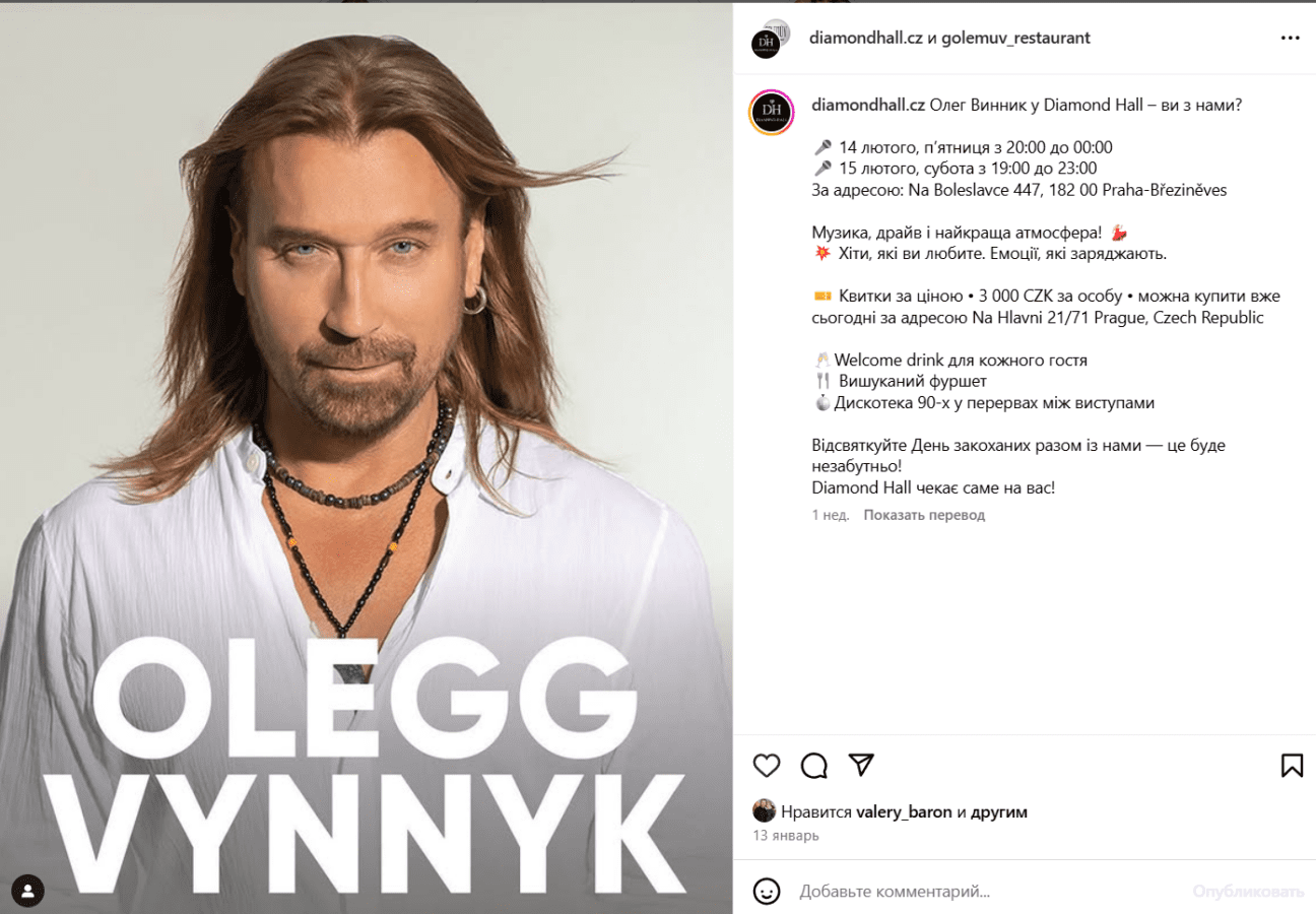Нові концерти Олега Винника заплановані на 14 та 15 лютого 2025 року в празькому ресторані The Diamond Hall. Цікаво, що вартість квитків на чеські виступи значно вища, ніж була заявлена на скасований концерт у Польщі. За 3 тисячі крон (понад 5 тисяч гривень) глядачі отримають не тільки можливість послухати виступ “маестро”, але й welcome-drink, фуршет та дискотеку під хіти 90-х. Програма вечора передбачає, що виступ співака буде поєднано з танцювальною частиною.