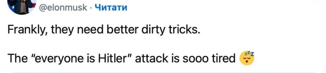 “Чесно кажучи, їм потрібні великі брудні трюки. Атака ‘всі – Гітлери’ вже дуже набридла,” – зазначив Маск, додавши до свого повідомлення емодзі, що символізує втому та нудьгу.