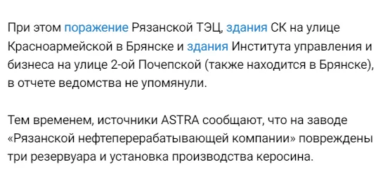 Крім того, окремі джерела новин повідомляють про пожежу на заводі з виробництва мікроелектроніки «Кремній Ел» у Брянську. Це підприємство є постачальником для Міністерства оборони Росії. Свідки зафіксували подію, зацікавлені в наслідках атаки.