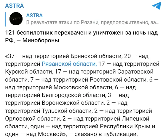 Російський губернатор Рязанської області повідомив, що сили протиповітряної оборони вдало відбили атаку, хоча жителі продовжують ділитися відео моментів налету дронів. За попередньою інформацією, жертв серед цивільного населення немає, натомість триває оцінка матеріальних збитків.