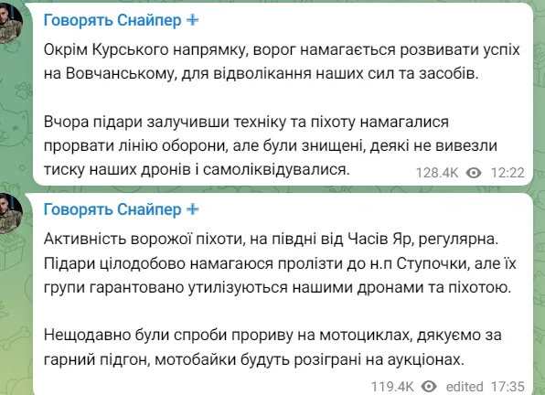 “Окупанти постійно намагаються прорватися до Ступочок, проте їхні групи систематично ліквідуються за допомогою дронів і піхоти. Нещодавно ми зафіксували спроби атаки на мотоциклах — дякуємо за підгонку, ці байки будуть розіграні на аукціонах“, – додав він.